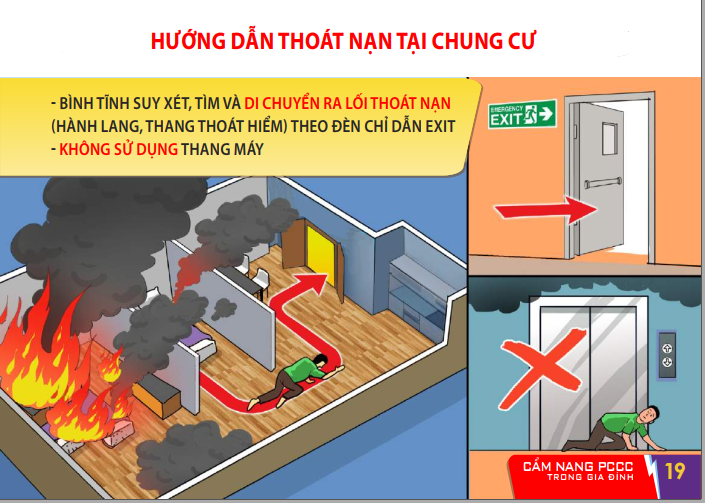 chen lấn xô đẩy, không sử dụng thang máy để thoát nạn vì khi có sự cố cháy, nổ